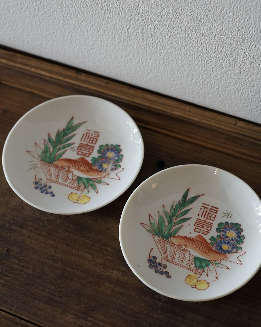 中国において縁起のいい、「福寿」の文字、魚、桃などが書かれたお皿。