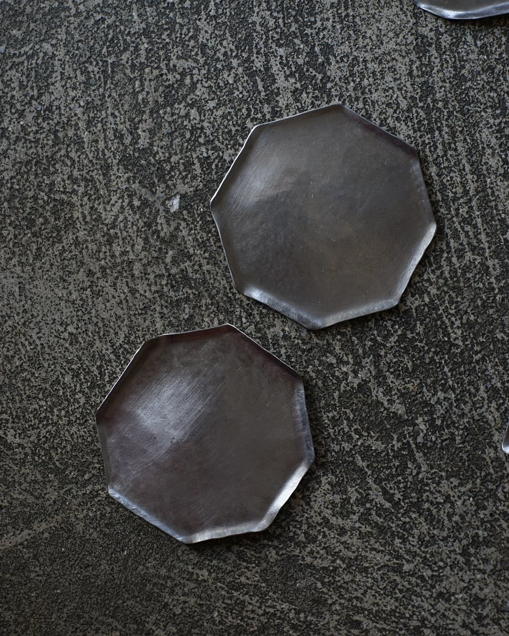 加工が難しいステンレスをラッコのようにハンマーで叩いて造形した茶托