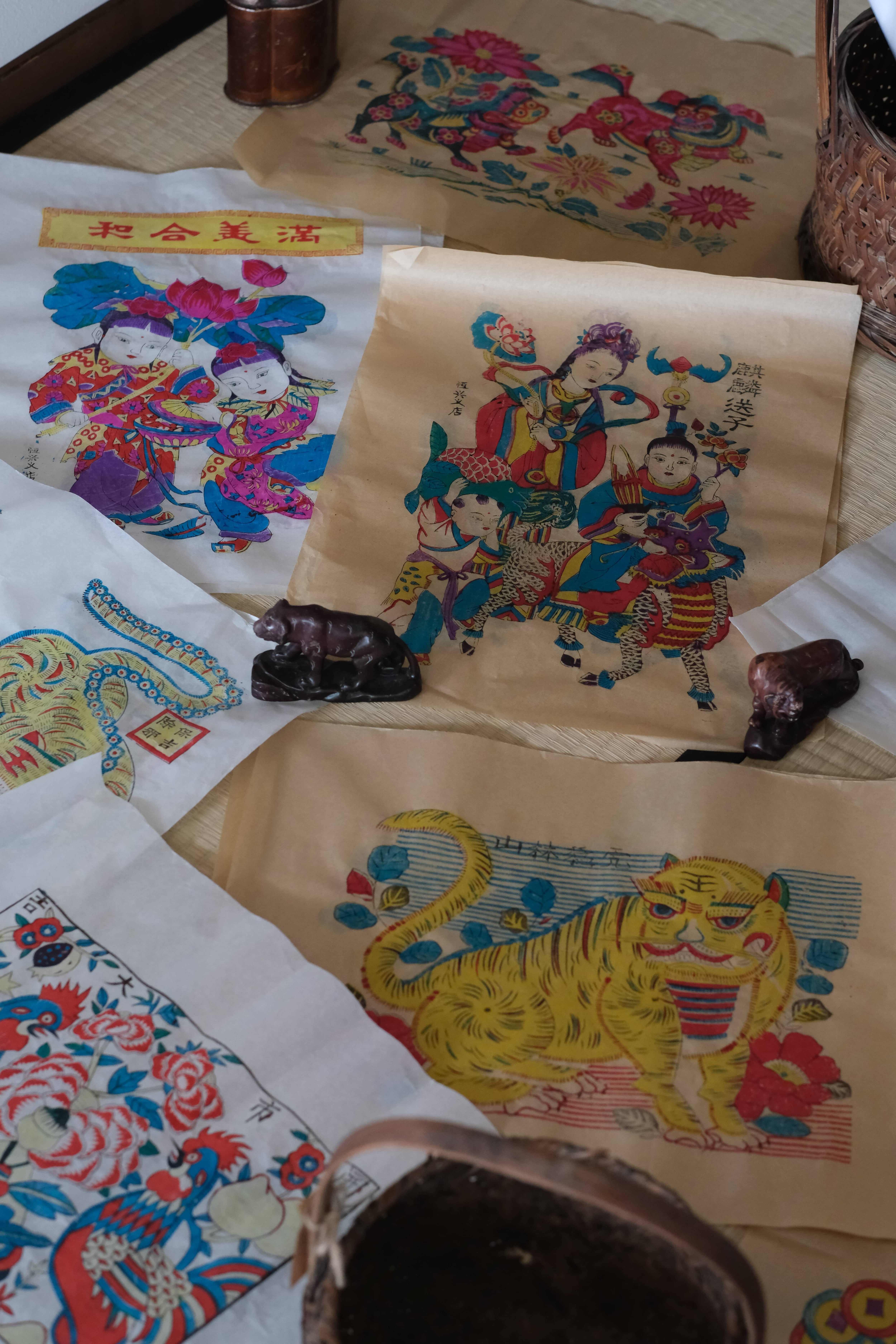 中国で扉に飾られる縁起物の版画は、主に「年画(ねんが)」と呼ばれます。これらは旧正月(春節)の時期に、家の中に福や幸運を招き、邪気を払う目的で貼られる伝統的な民衆芸術です。