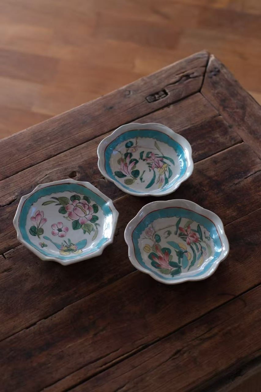 【清代末期】春を彩る粉彩 高台輪花皿