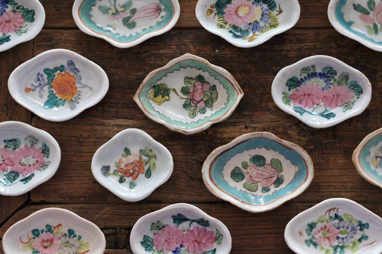 経年によるわずかな擦れ、貫入や色の沈着、小さなヒビや欠け、当時の製造工程で生じた窯傷(小さな黒点や釉薬のムラなど)が見られる場合がございます。古いものならではの味わい、景色としてお楽しみいただけますと幸いです。
