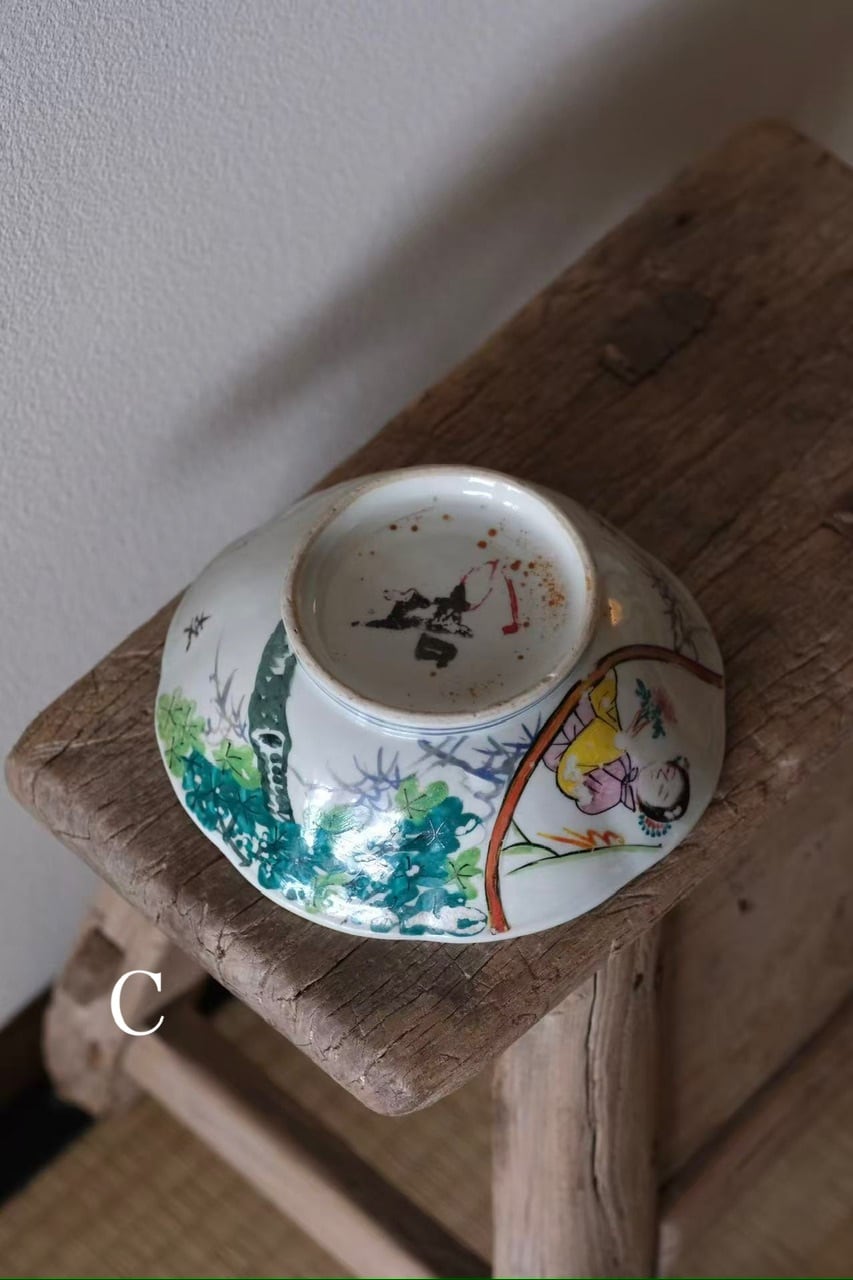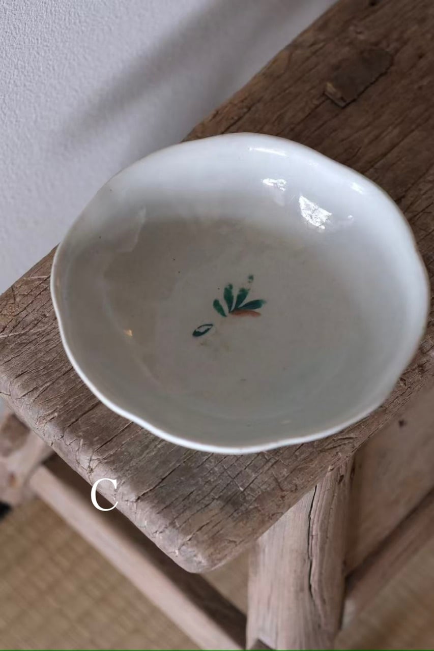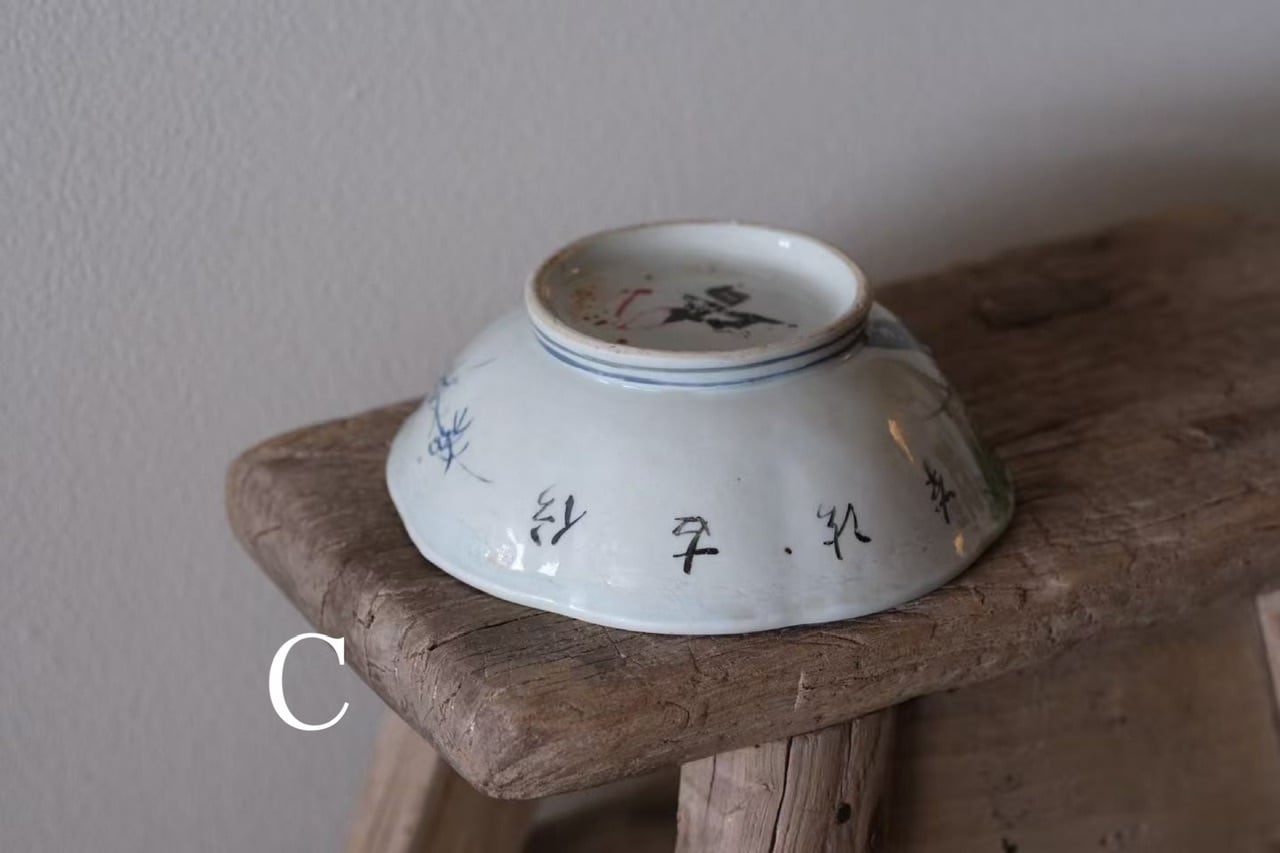 経年によるわずかな擦れ、貫入や色の沈着、小さなヒビや欠け、当時の製造工程で生じた窯傷(小さな黒点や釉薬のムラなど)が見られる場合がございます。古いものならではの味わい、景色としてお楽しみいただけますと幸いです。