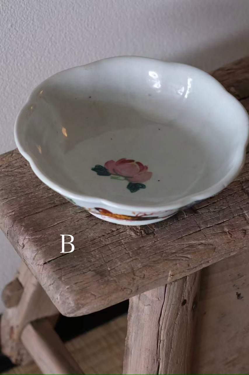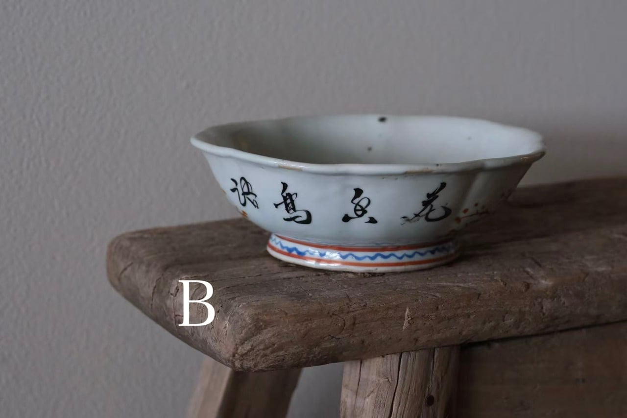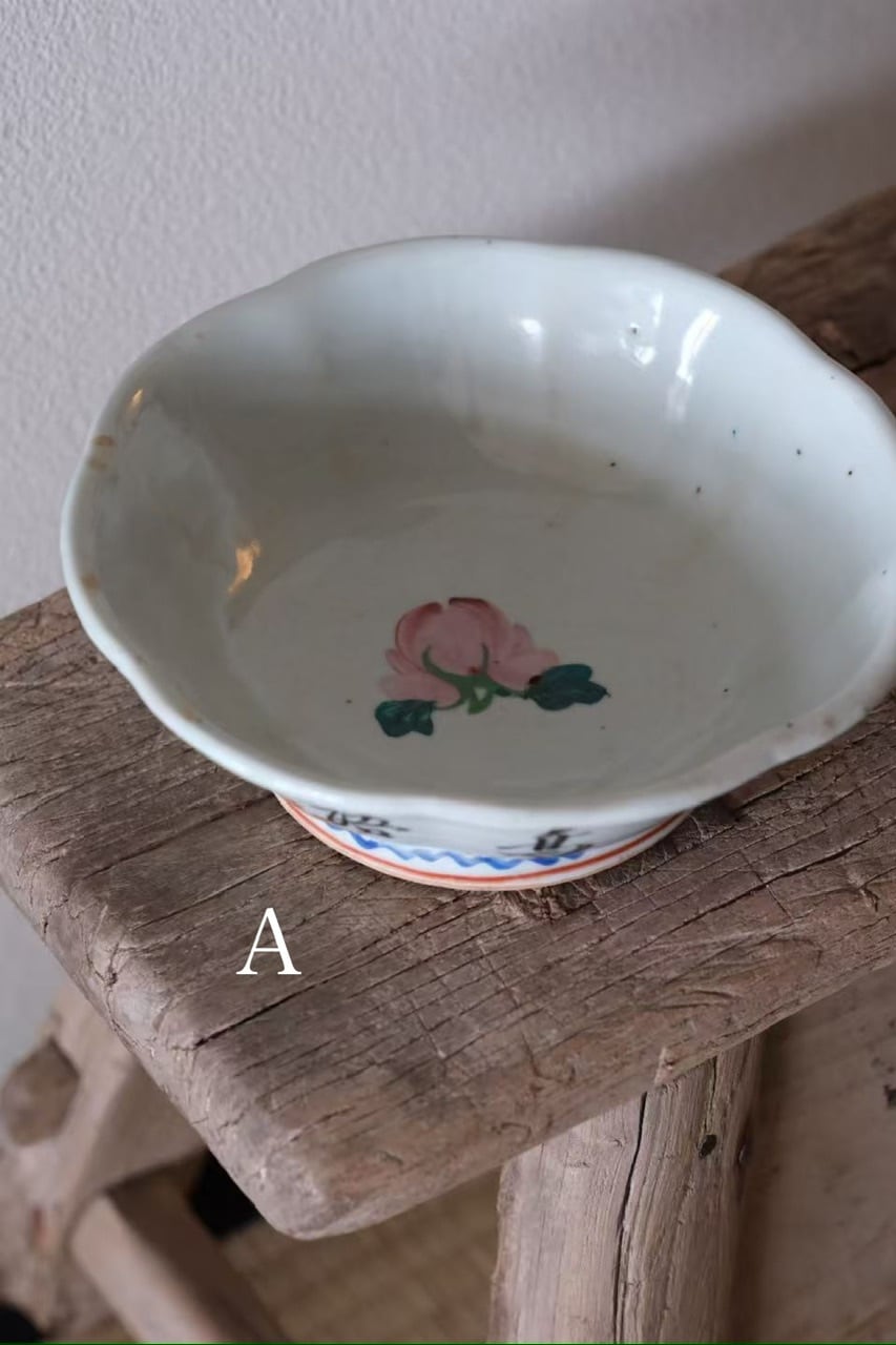 経年によるわずかな擦れ、貫入や色の沈着、小さなヒビや欠け、当時の製造工程で生じた窯傷(小さな黒点や釉薬のムラなど)が見られる場合がございます。古いものならではの味わい、景色としてお楽しみいただけますと幸いです。