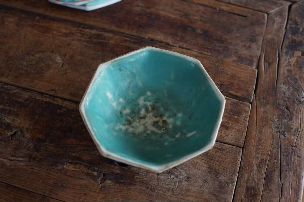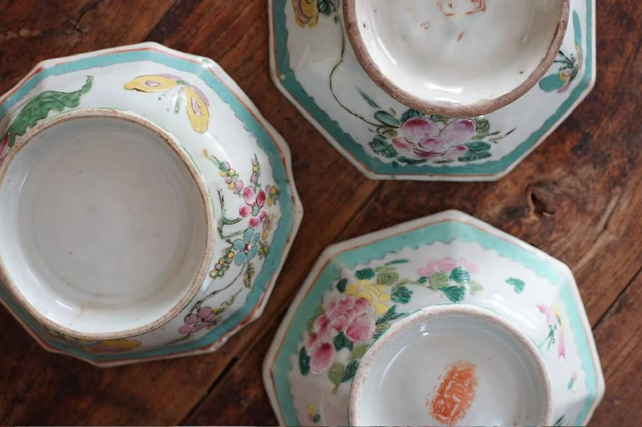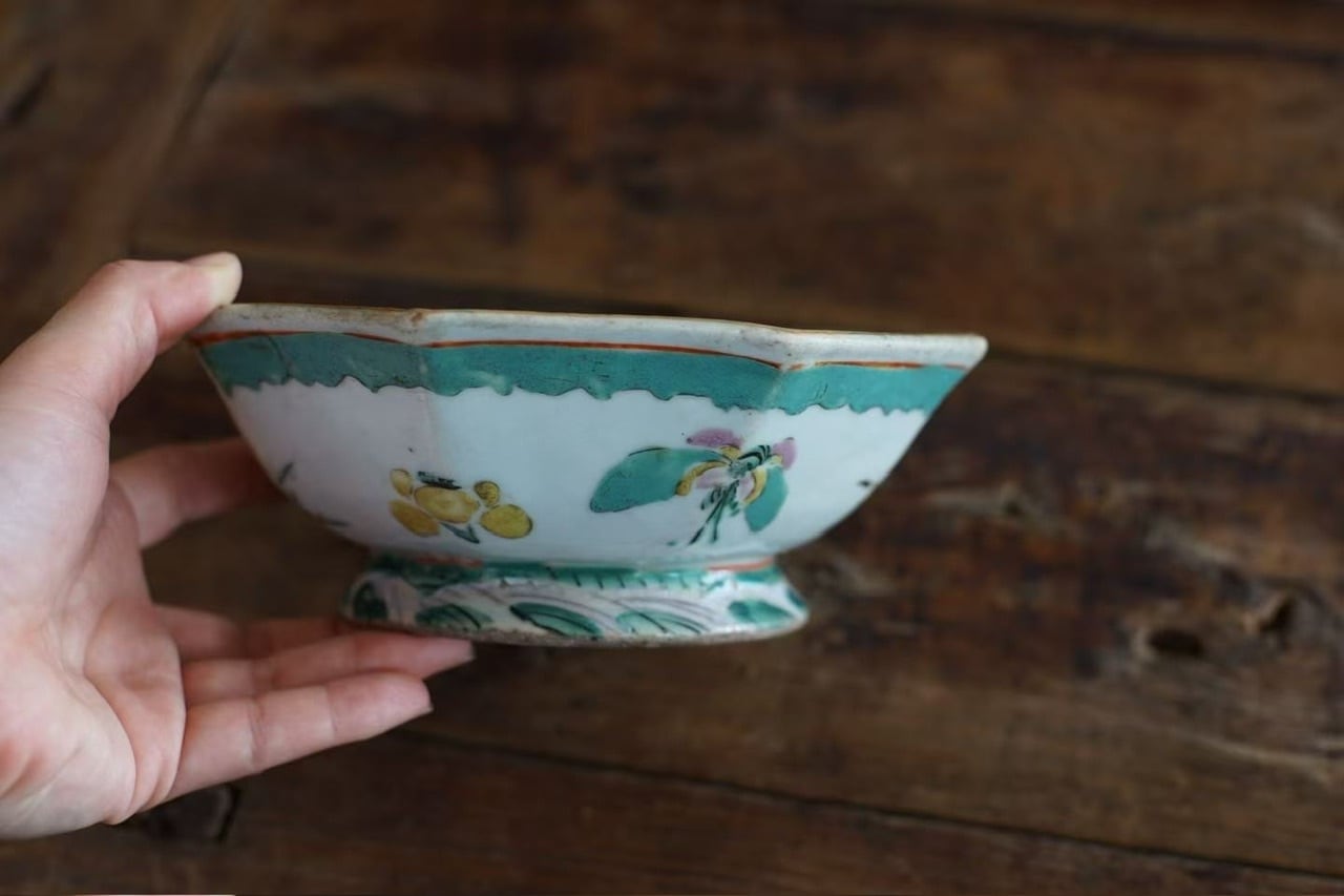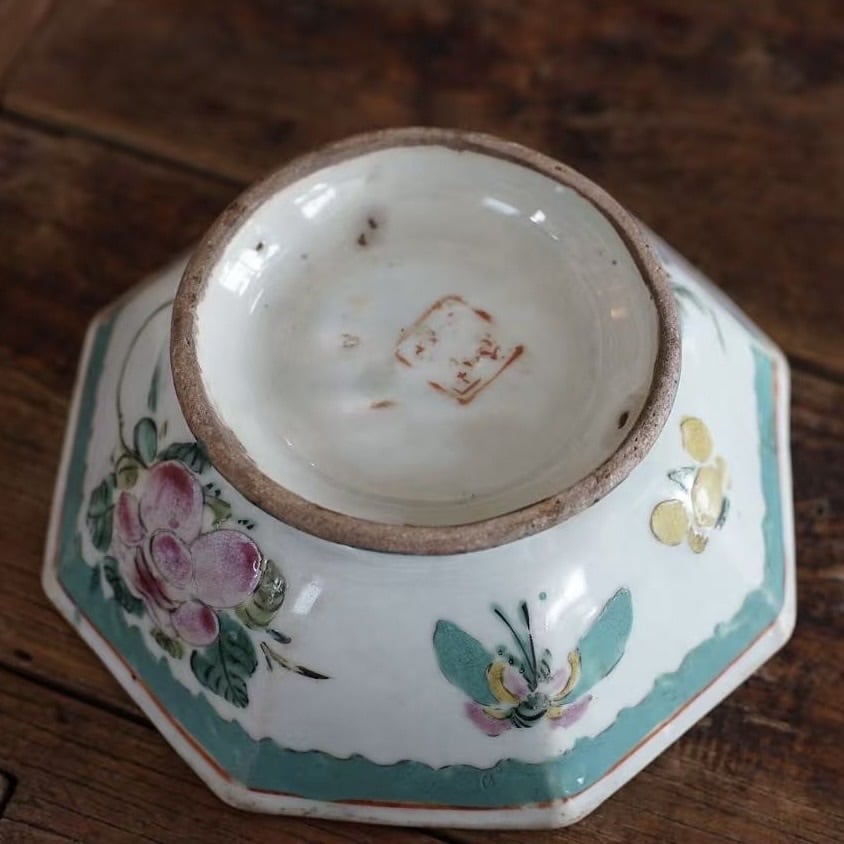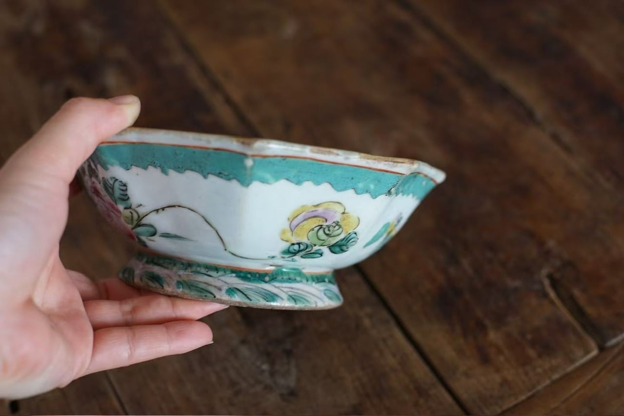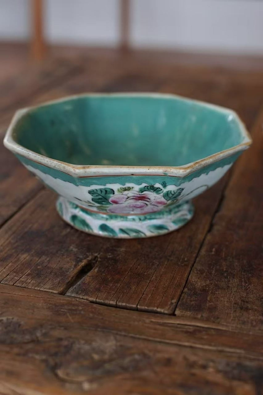 こちらは清代末期に作られた年代物です。経年によるわずかな擦れ、貫入や色の沈着、小さなヒビや欠け、当時の製造工程で生じた窯傷(小さな黒点や釉薬のムラなど)が見られる場合がございます。古いものならではの味わい、景色としてお楽しみいただけますと幸いです。
