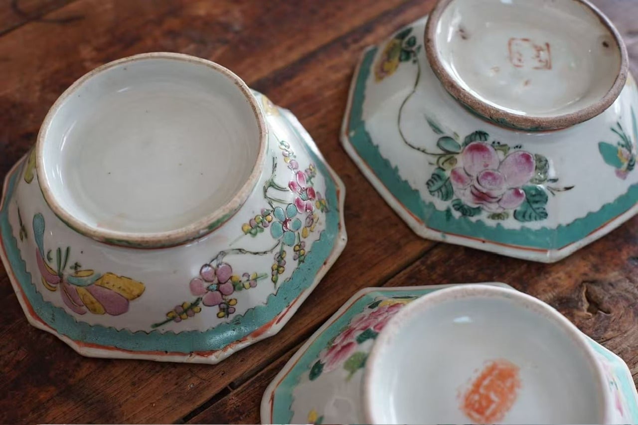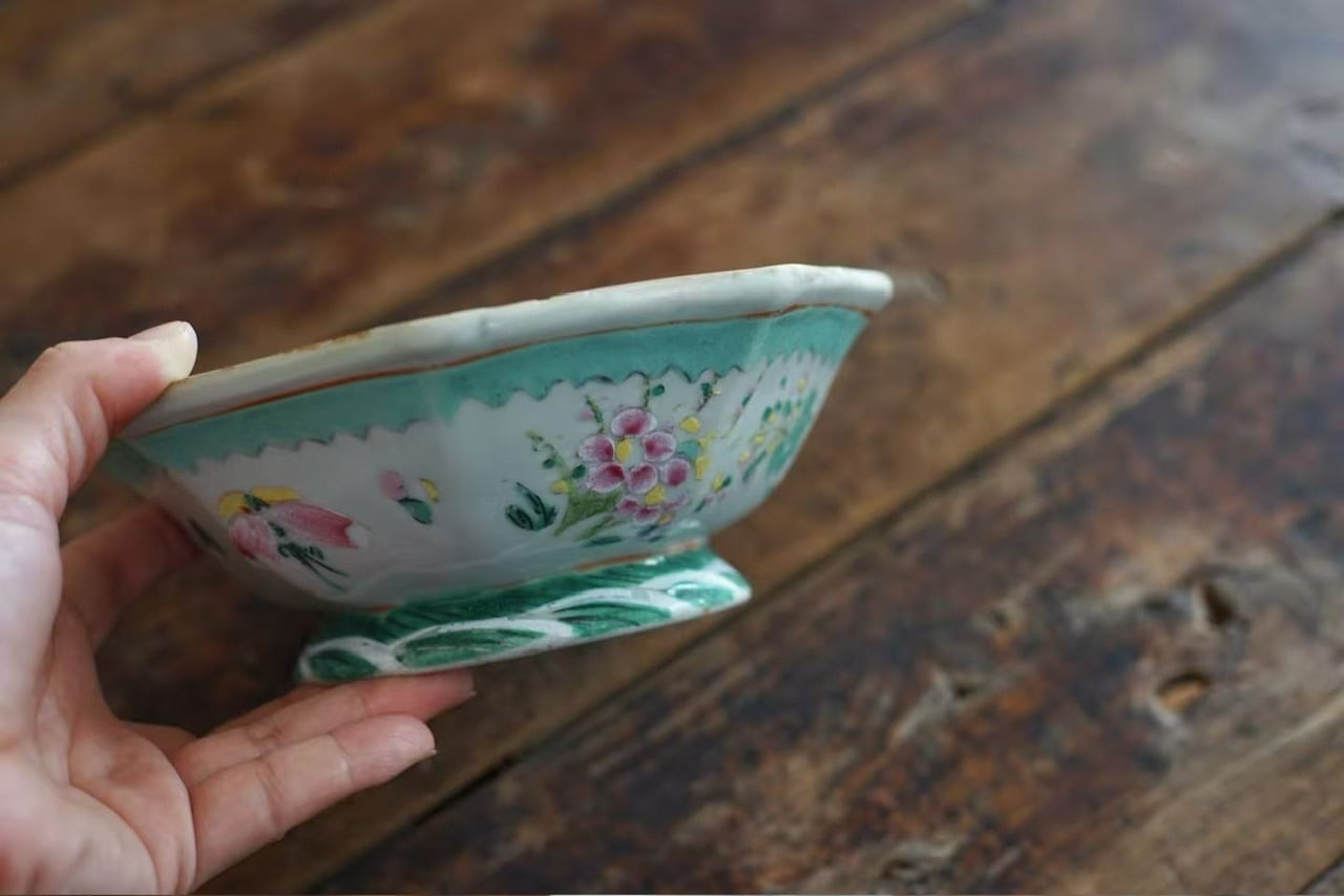 こちらは清代末期に作られた年代物です。経年によるわずかな擦れ、貫入や色の沈着、小さなヒビや欠け、当時の製造工程で生じた窯傷(小さな黒点や釉薬のムラなど)が見られる場合がございます。古いものならではの味わい、景色としてお楽しみいただけますと幸いです。
