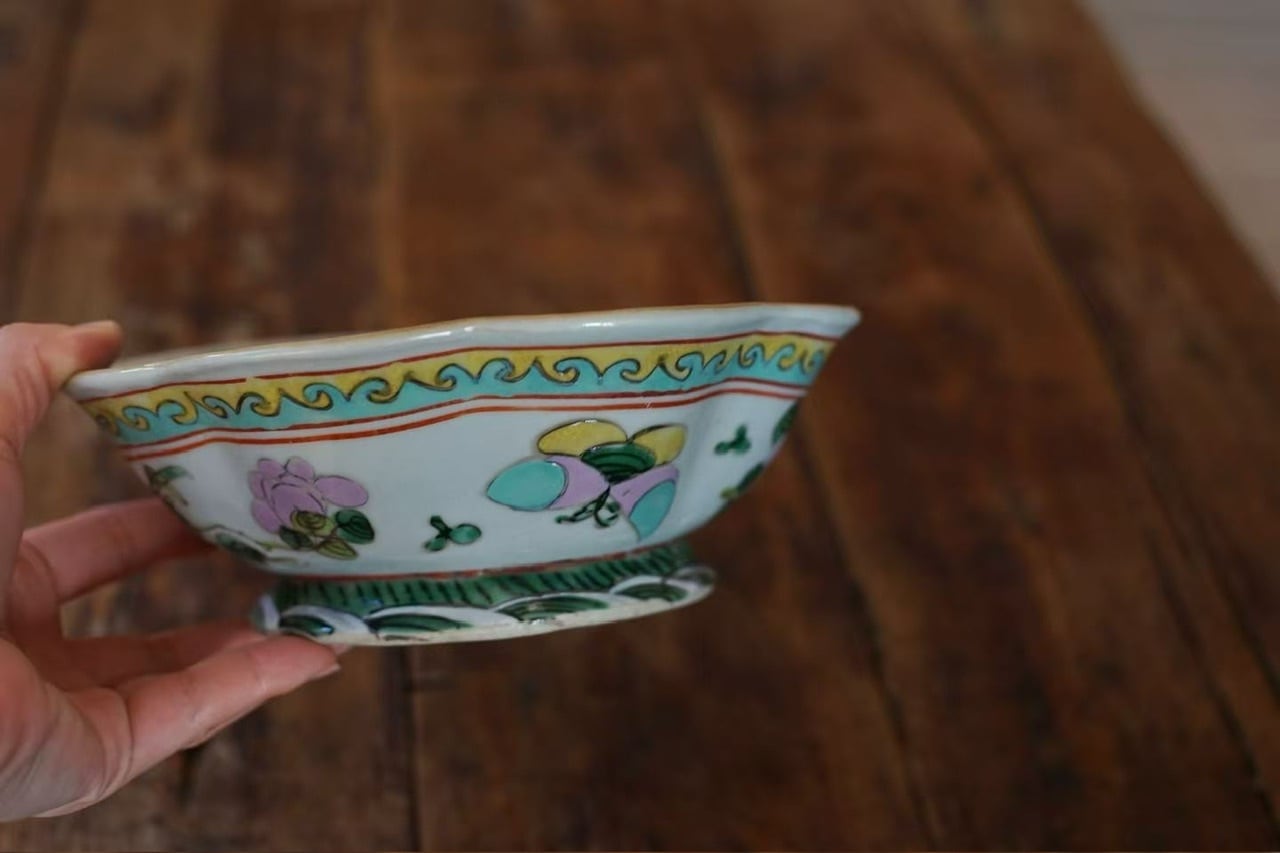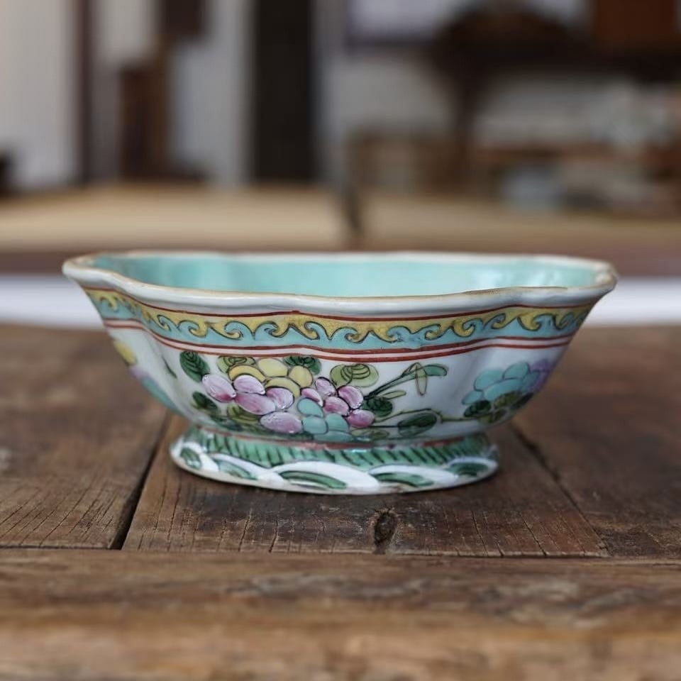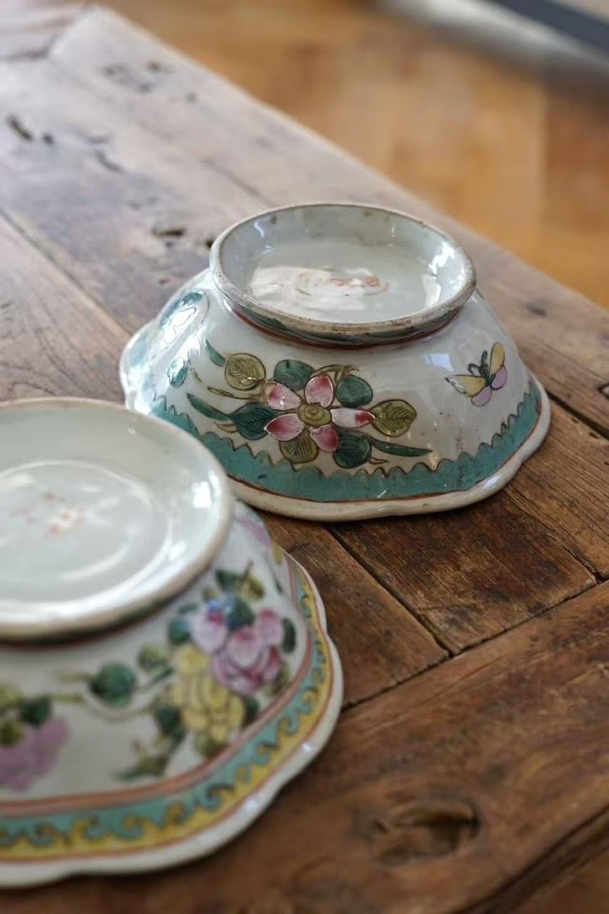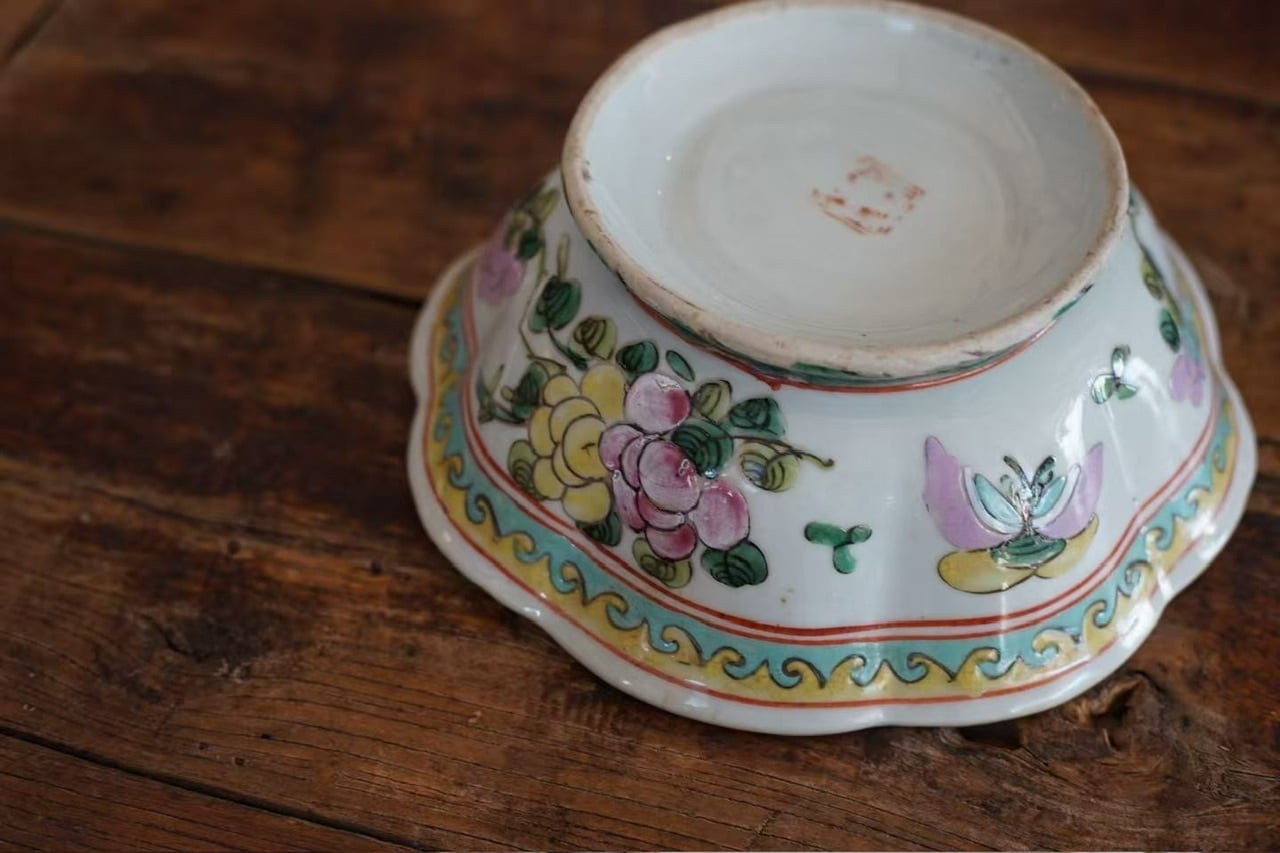 こちらは清代末期に作られた年代物です。経年によるわずかな擦れ、貫入や色の沈着、小さなヒビや欠け、当時の製造工程で生じた窯傷(小さな黒点や釉薬のムラなど)が見られる場合がございます。古いものならではの味わい、景色としてお楽しみいただけますと幸いです。